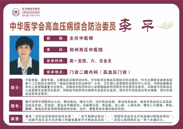 中医世家、退休专家。从事临床及教学近40年,中华医学会高血压病综合防治委员。作为主要研究者参加国家十二五科技支撑项目“高血压病综合防治研究”七年。卫生部心血管病防治研究中心会员,河南省康复医学会心血管病康复分会委员,河南省中医药协会心血管病临床用药研究专业委员会委员,河南省中西医结合心血管病专业委员会委员,河南省中医药学会络病专业委员会委员,郑州市中西医结合学会理事,郑州市高血压医学会委员。