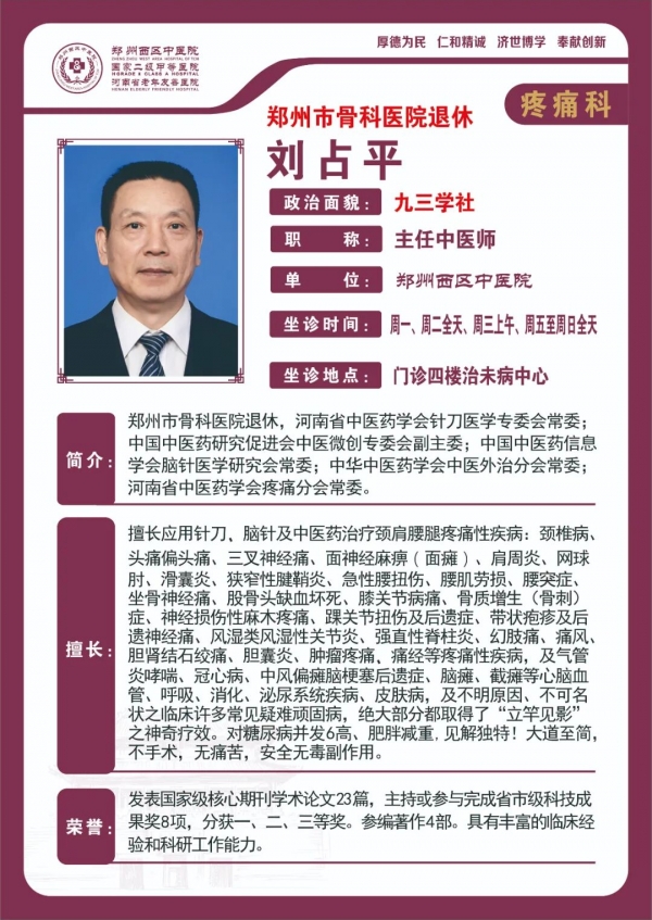 郑州市骨科医院退休,河南省中医药学会针刀医学专委会常委;中国中医药研究促进会中医微创专委会副主委;中国中医药信息学会脑针医学研究会常委;中华中医药学会中医外治分会常委;河南省中医药学会疼痛分会常委。