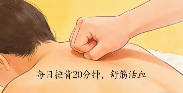 握空心拳或用虚掌拍击背部,每分钟60-80下,每日1-2次,每次20分钟。能舒经活血、振奋阳气。