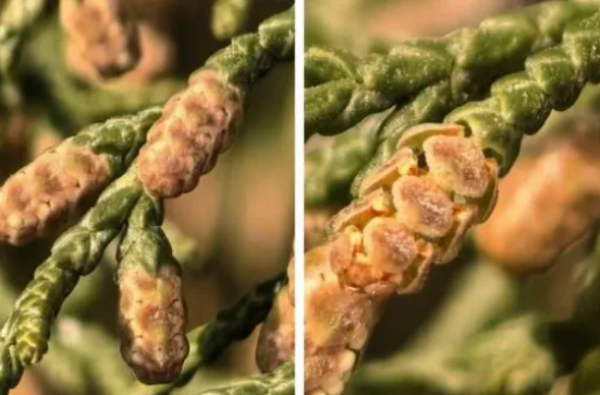 柏树选择在早春叶子还未茂密时开花,因为此时风力畅通无阻。而温暖、干燥、有风的天气,就是它左图为含苞待放的柏树花。