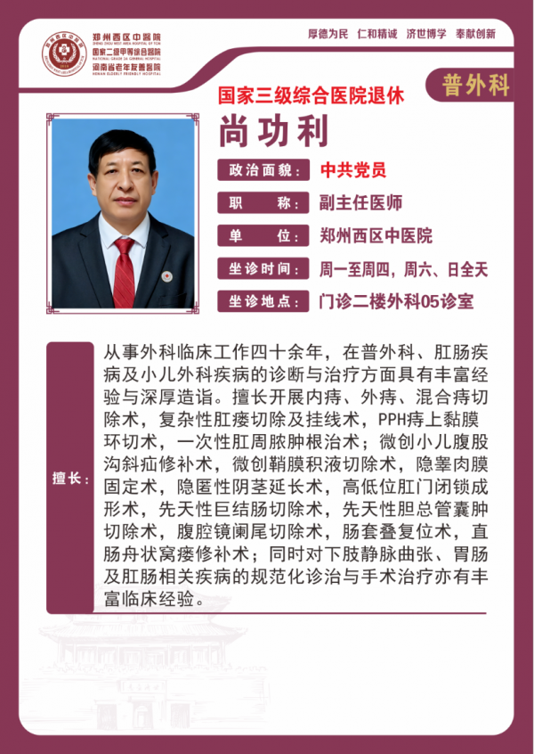 从事外科临床工作四十余年,在普外科、肛肠疾病及小儿外科疾病的诊断与治疗方面具有丰富经验与深厚造诣。擅长开展内痔、外痔、混合痔切除术,复杂性肛瘘切除及挂线术,PPH痔上黏膜环切术,一次性肛周脓肿根治术;微创小儿腹股:沟斜疝修补术,微创鞘膜积液切除术,隐睾肉膜固定术,隐匿性阴茎延长术,高低位肛门闭锁成形术,先天性巨结肠切除术,先天性胆总管囊肿切除术,腹腔镜阑尾切除术,肠套叠复位术,直肠舟状窝瘘修补术;同时对下肢静脉曲张、胃肠及肛肠相关疾病的规范化诊治与手术治疗亦有丰富临床经验。